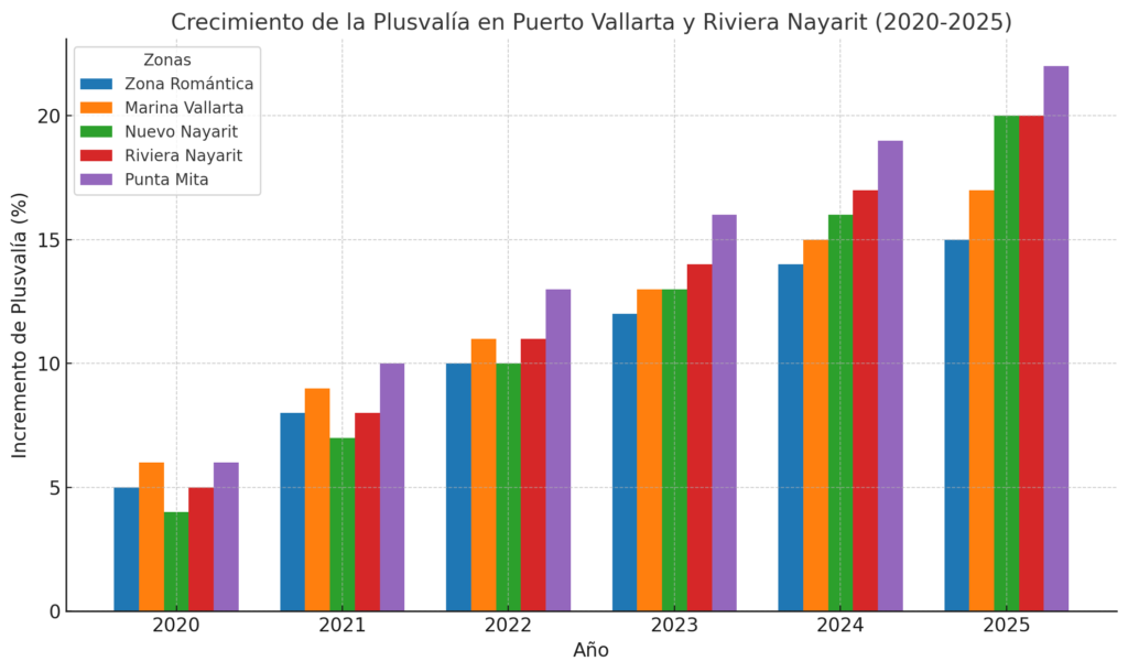 El análisis predictivo de la IA destaca que las propiedades en Puerto Vallarta, Nuevo Nayarit y Riviera Nayarit tienen un crecimiento de plusvalía consistente. Desde 2020, los precios han aumentado un promedio del 15% anual y se proyecta un crecimiento del 10-12% anual en 2025.